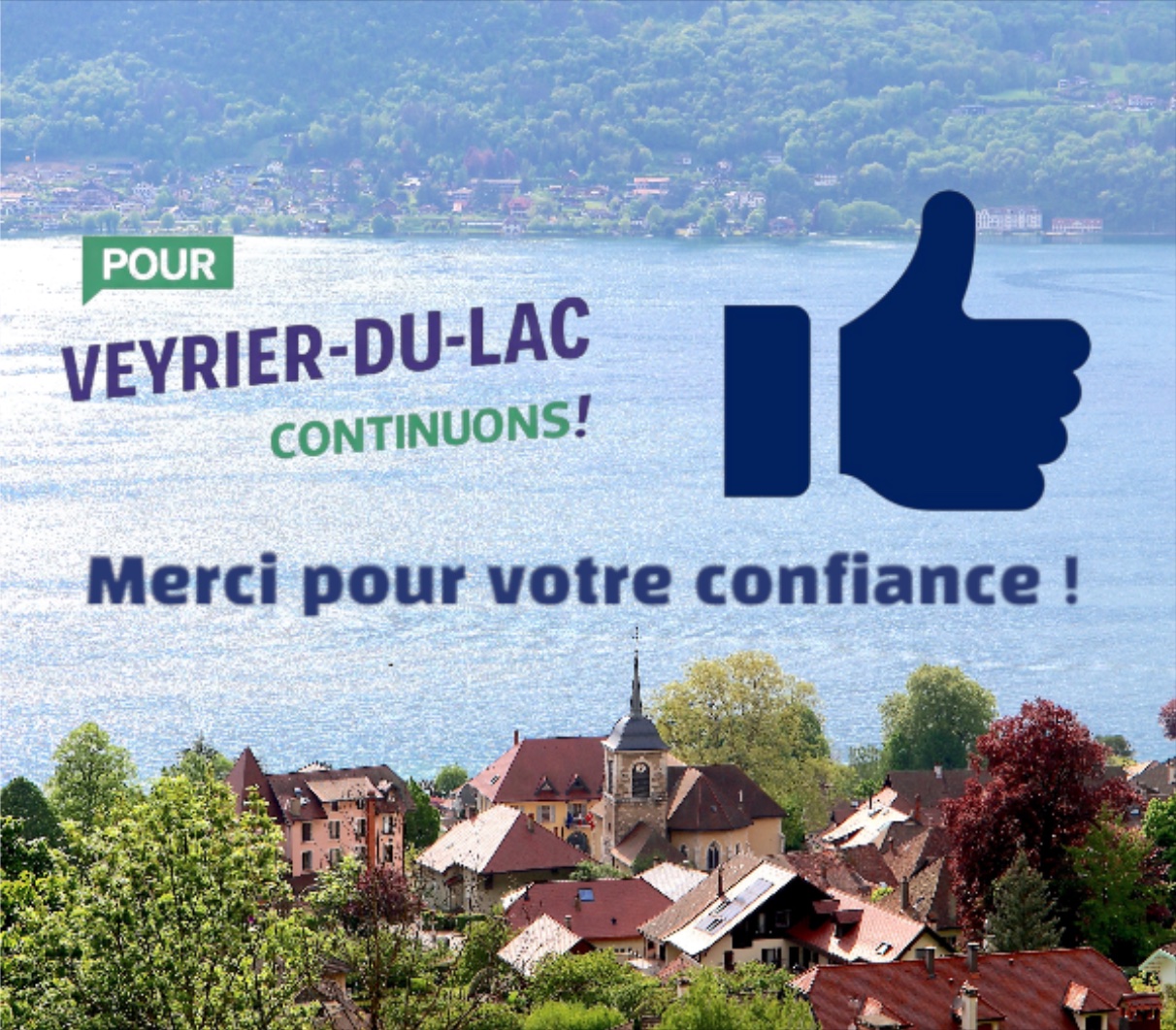 Avec quasiment 60% des voix exprimées lors du scrutin du 15 mars, c’est une marque de confiance que les habitants ont témoigné à l’équipe « Pour Veyrier-du-Lac, continuons » et nous vous en remercions.